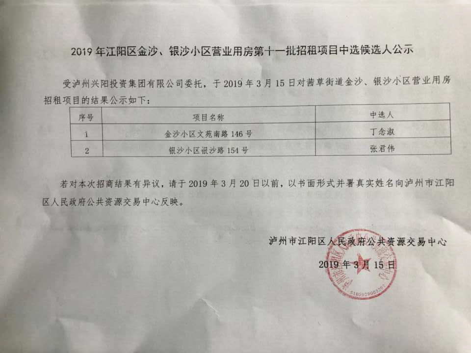 2019年江阳区金沙、银沙小区营业用房第十一批招租项目中选候选人公示